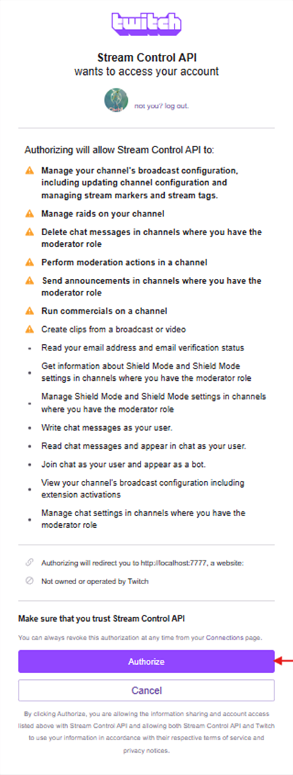 (Note: We do not access your personal data. The app only allows us to control certain Twitch actions from Stream Control.)